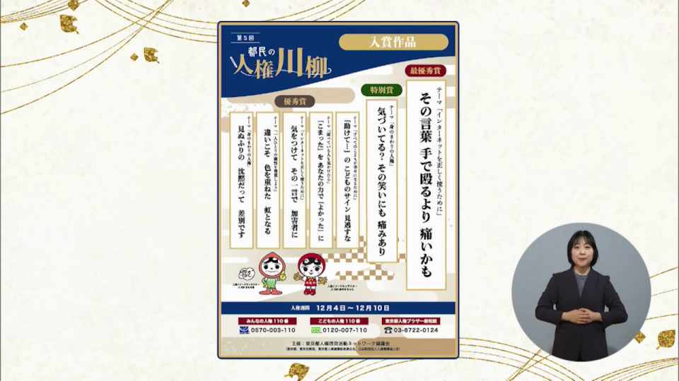 人権に対する思いを五・七・五の言葉で表現する「都民の人権川柳」では、最優秀賞1作品、特別賞1作品、優秀賞5作品が決定しました。
