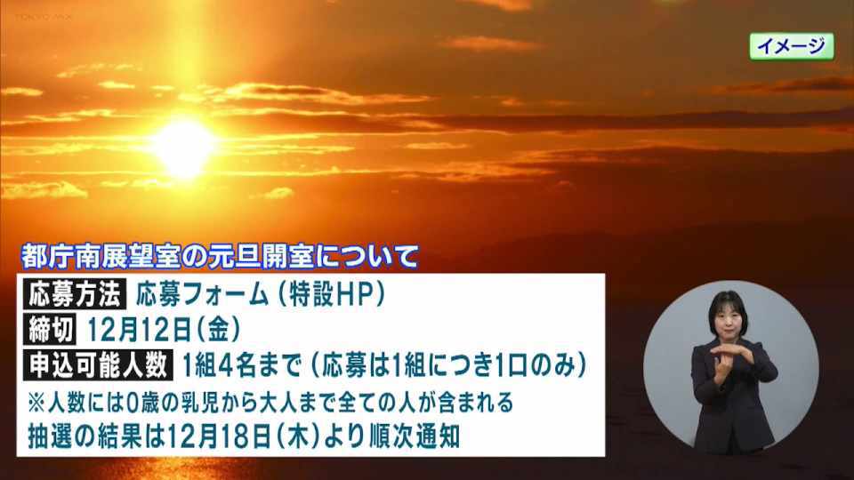 入室を希望する人は、特設ホームページ「都庁展望室 初日の出観覧」の応募フォームから、12月12日(金)までにお申し込みください。
