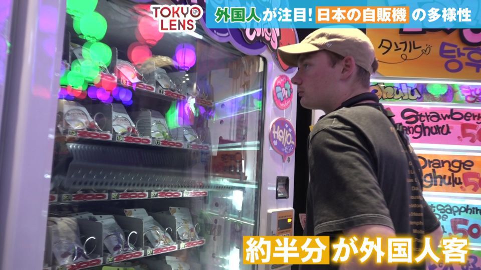 そんな日本の自動販売機を国内外にアピールするため、渋谷にオープンしたのは自販機だけが並ぶ施設「ジハン・キホーテSHIBUYA」です(現在は閉店)。搾りたてのオレンジジュースが飲めるものや、カップラーメンが買えるものまで、設置された自販機は13種類。その珍しさから多くの外国人が訪れていて、客の約半分を占めています。