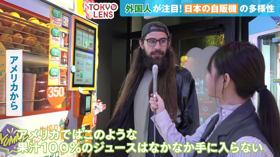 アメリカから来た男性が購入したのは、グミ。「たいてい自販機は飲み物だけなので、お菓子の自販機を見つけてワクワクしました」と喜びます。もう一人の男性は「アメリカではこのような果汁100%のジュースはなかなか手に入らない。日本では道を歩いていると買えるのが本当にすごい」と、日本の自動販売機の数と種類に驚いていました。