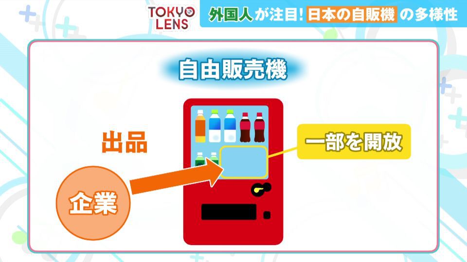 そして日本では今、自動販売機の形態が進化しています。都内の企業が行っているのが、「自由販売機」。これは自動販売機の棚の一部を開放し、企業などがその枠を契約することで自由に商品を出品できる仕組みです。