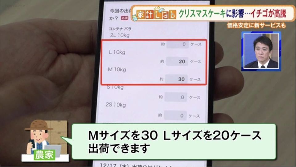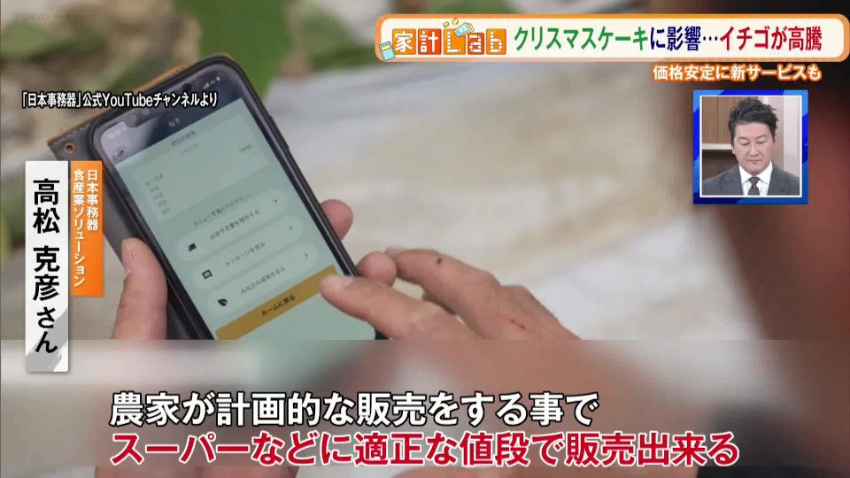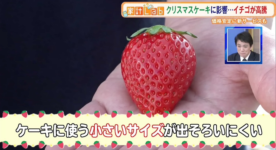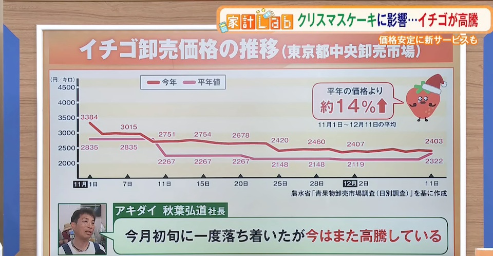 東京都中央卸売市場の今年のイチゴ卸売価格は昨年に比べ上昇。平年より約14%高騰しています。東京都にあるスーパーマーケット「アキダイ」の秋葉弘道社長によると、イチゴの価格は12月初旬に一時期安定したものの、その後再び上がっているということです。