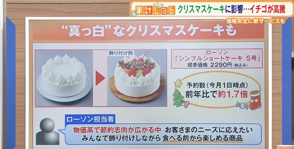 そして、イチゴが高騰する中、今年はあるクリスマスケーキが注目を集めています。それは、イチゴなどのトッピングがない“真っ白なクリスマスケーキ”です。ローソンでは2年前からこれを販売しているそうですが、今年の予約数は前年比1,7倍。担当者は物価高が進む中で節約志向が広がっているが、お客様のニーズに応えたいと話します。