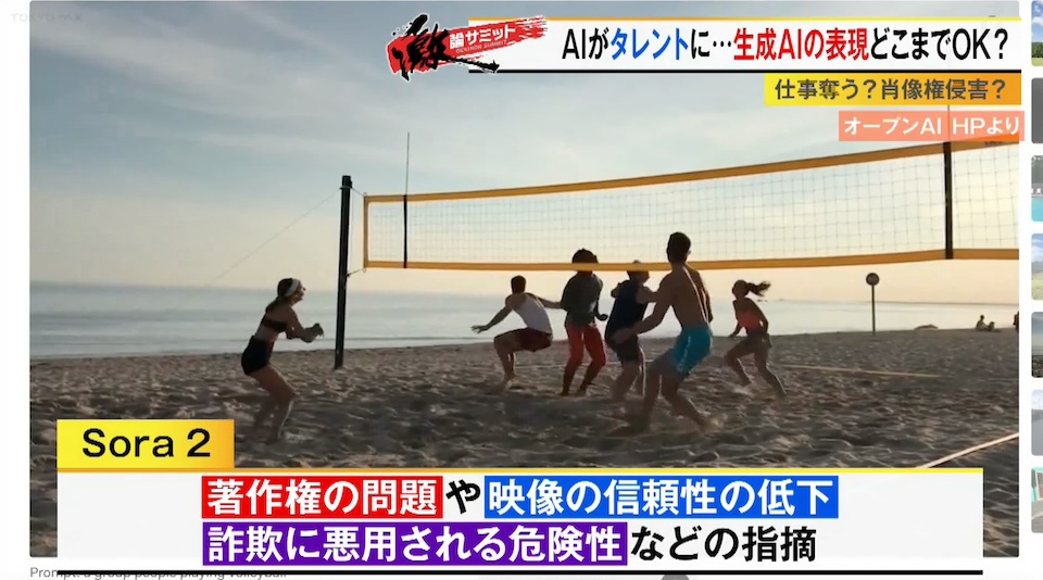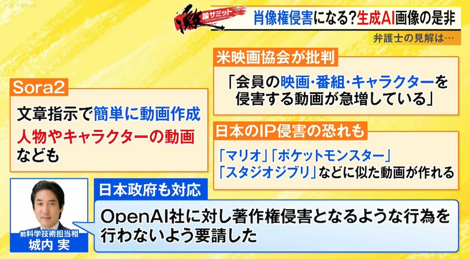2025年9月にローンチされた「Sora2」は文章による指示で簡単に動画を作成することができ、人物やキャラクターの動画なども作成可能です。これに対しアメリカ映画協会は「会員の映画・番組・キャラクターを侵害する動画が急増している」として即時対応を要求。また、「マリオ」や「ポケットモンスター」、「スタジオジブリ」などに似たキャラクターも生成できることから国内でも批判が高まりました。