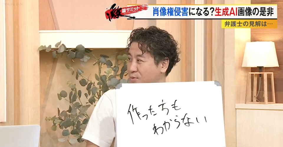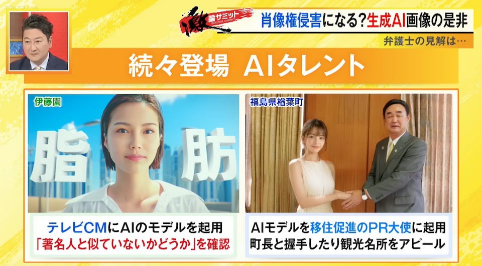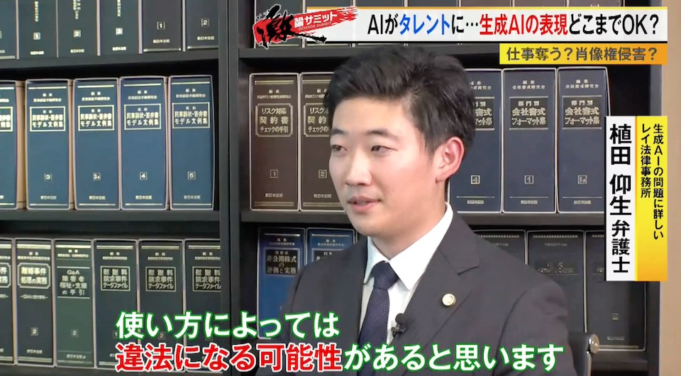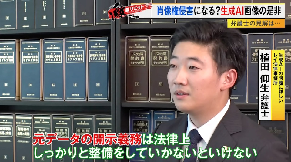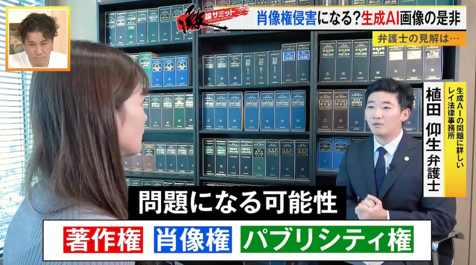 似ているというだけで肖像権侵害は主張できるのか。植田弁護士に聞いてみると「法律上問題になる点はいくつかあり、例えば著作権違反、肖像権、パブリシティ権が主に問題になる。おそらく学習させた元データがあると思うが、それもひとつの著作物。それと似ている、関係がある場合には著作権侵害になる可能性がある。どのくらい元データに似ているかが著作権侵害の分かれ道になる」と言います。