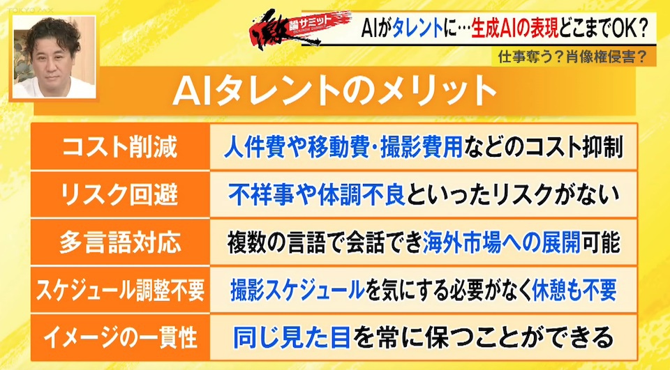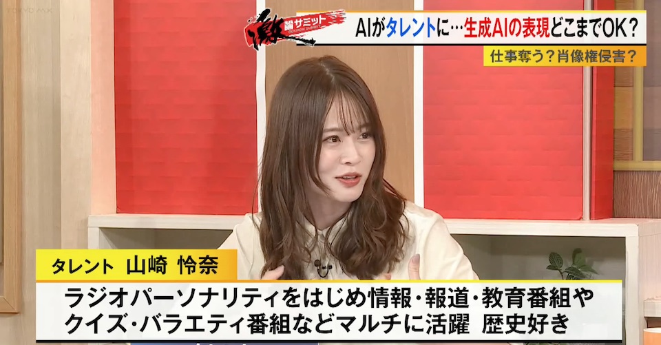タレントの山崎怜奈さんも起用するものによると前置きしつつ「ファンを作り、集客できるのかは生身の人間とAIタレントの違いでもあるのかなと思う」と私見を述べると、堀も「相当個性を持ったAIじゃないとファンは付きにくい」と追従。