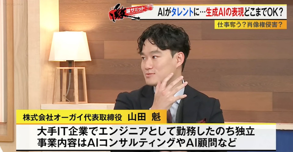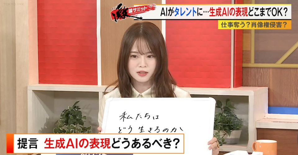 しかし、キャスターの田中陽南からは「初音ミクなどの人気を見ていると人に依存するものでもないのかなという気がする」という意見が。堀は「これだけ二次元の産業が成り立っている日本だからこそだが、それ(キャラクター)と同じ捉え方でもよいか?」と問うと、山田さんは「初音ミクも最初は人間が作り、その後同じようなものがAIから生まれているが、結局初音ミクが一番いいとされている。やはり人間の熱量や関係値というのは大事」との意見が。さらに「人は裏の物語を見たいものと思うが、AIにはそれがあまりない。だから人が作ったものは残っていくのでは」と語ります。