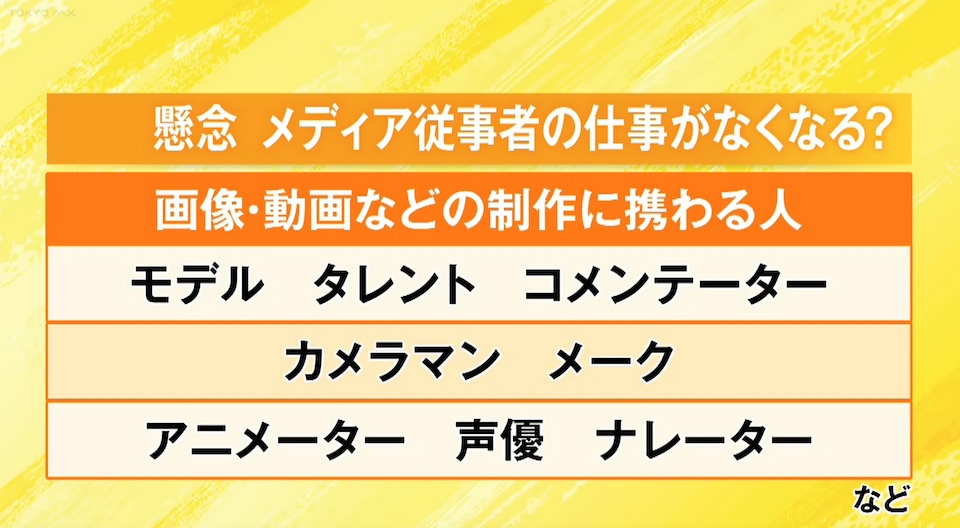 AIタレントの起用については懸念点もあります。ひとつはこれまで画像や動画などの制作に関わっていた人たちの仕事がなくなること。例えばモデル、タレント、コメンテーターやカメラマン、メイク、アニメを作るアニメーターや声優などが挙げられています。