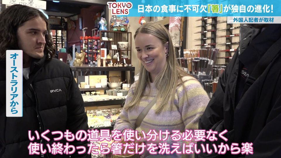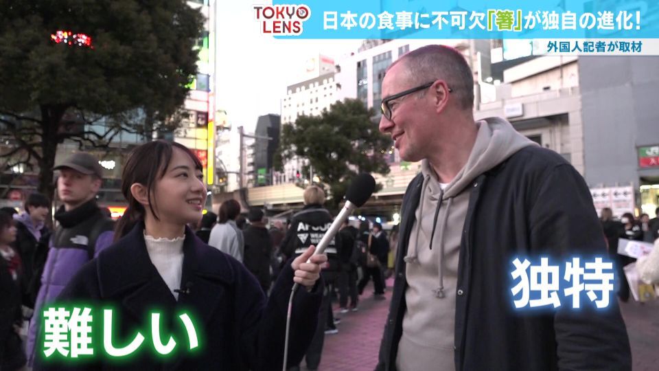 日本の食卓に欠かせない食器「箸」。普段、箸を使わない外国人に日本の箸文化について聞いてみると、アメリカから来た女性は「箸を使うのは本当にすごいスキル。日本の皆さんは誇りに思っていいと思う」と感嘆し、アイルランドから来た男性は「日本に来て初めて箸を使った。難しかった、使い方にコツがいるよね」と言い、総じて「独特」「使いこなすのが難しい」といった意見が。