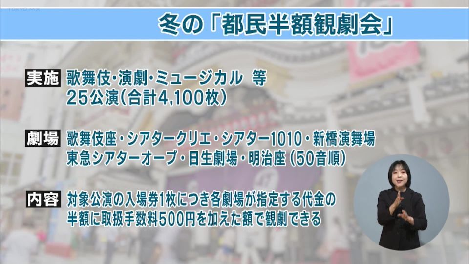 今回の「都民半額観劇会」は、歌舞伎、演劇、ミュージカルなど、25の公演で実施されます。入場券1枚につき、各劇場が指定する代金の半額に取扱手数料500円を加えた額で観劇できます。