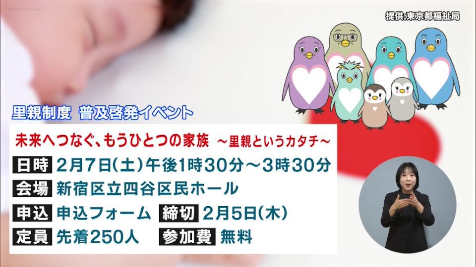 里親制度について多くの人に知ってもらい、理解を深めてもらうための普及啓発イベントは、2月7日(土)午後1時30分から、新宿区立四谷区民ホールで開かれます。