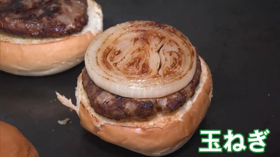 こちらは、パティにすき焼き風に味付けした煮玉ねぎ、チェダーチーズなどをバンズでサンドしたら、大胆に真ん中から半分にカット。さらに、パティからあふれ出てくる脂や旨みたっぷりの肉汁を活用して、ハンバーガーの断面を揚げ焼きにしたもの。