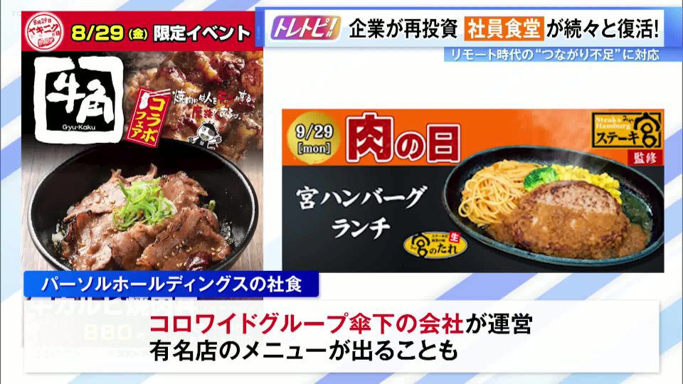 TOKYO MX(地上波9ch)朝の報道情報番組「Wake Up 7」(月~金曜 7:00~)。最新のトレンドを紹介する「トレトピ」のコーナーでは、再び脚光を浴びている「社員食堂」を取材しました。