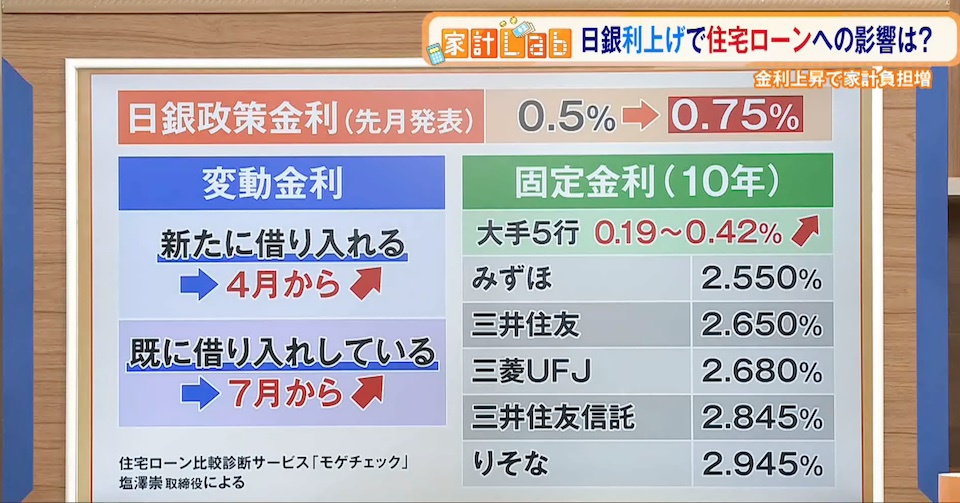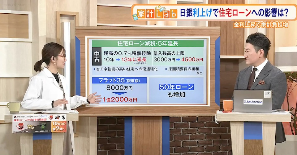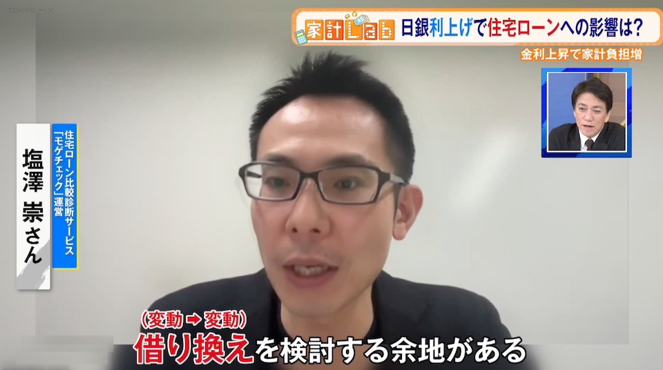 TOKYO MX(地上波9ch)の報道・情報生番組「堀潤 Live Junction」(毎週月~金曜20:00~)。家計に関するお金のニュースを深掘りする「豊崎由里絵の家計Lab」のコーナーでは、日本銀行の利上げによる住宅ローンへの影響について取り上げました。