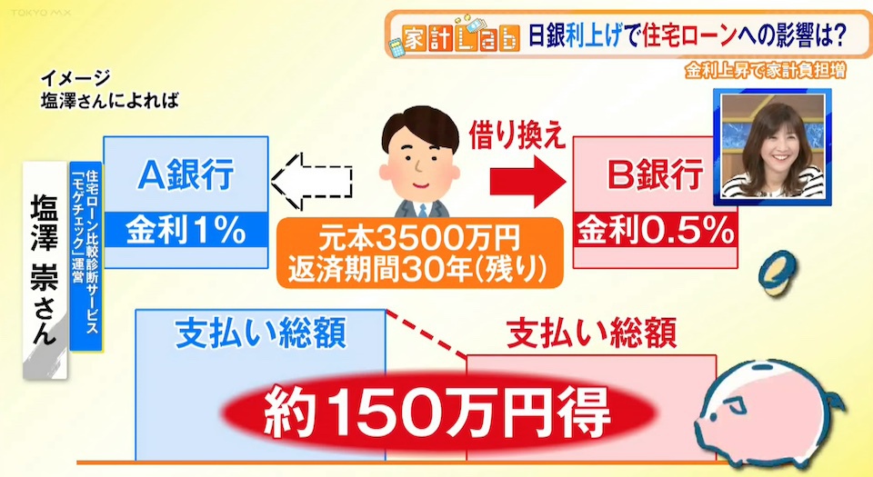 「0.3%以上金利が下がるのであれば、借り換えを検討する余地は十分あると考えています。前提として、元本3,500万円が残り、残りの返済期間が30年で、今の金利が1%の人が借り換えをしてどのくらいお得になるかというと、今、変動金利で一番安いのが0.5%という水準。それに借り換えると150万円ぐらいお得になる(場合もある)」と塩澤さんは指摘します。※借り換えた銀行の金利変動次第では損をする可能性もあります。