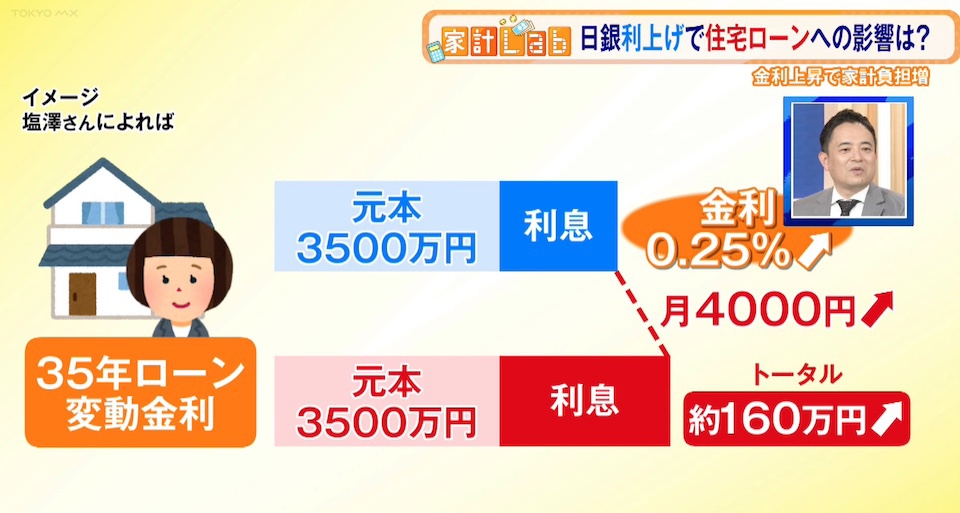 果たして今回の金利上昇が家計にどの程度影響があるのか。専門家の塩澤さんに話を伺いました。まず塩澤さんは住宅ローン平均額3,500万円を35年ローンの変動金利で借り入れている場合の返済額の変化に言及。金利が0.25%上昇することにより1ヵ月の返済額は約4,000円アップし、35年間トータルでは約160万円増えると試算します。