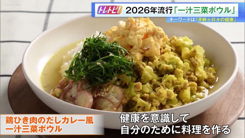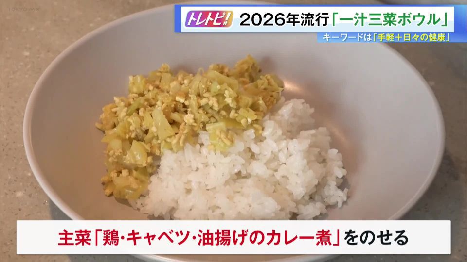番組では一汁三菜ボウルのレシピを紹介。作り方は、お皿に主食となるご飯を盛り付け、その上に主菜となる「鶏肉・キャベツ・油揚げで作ったカレー」を乗せます。