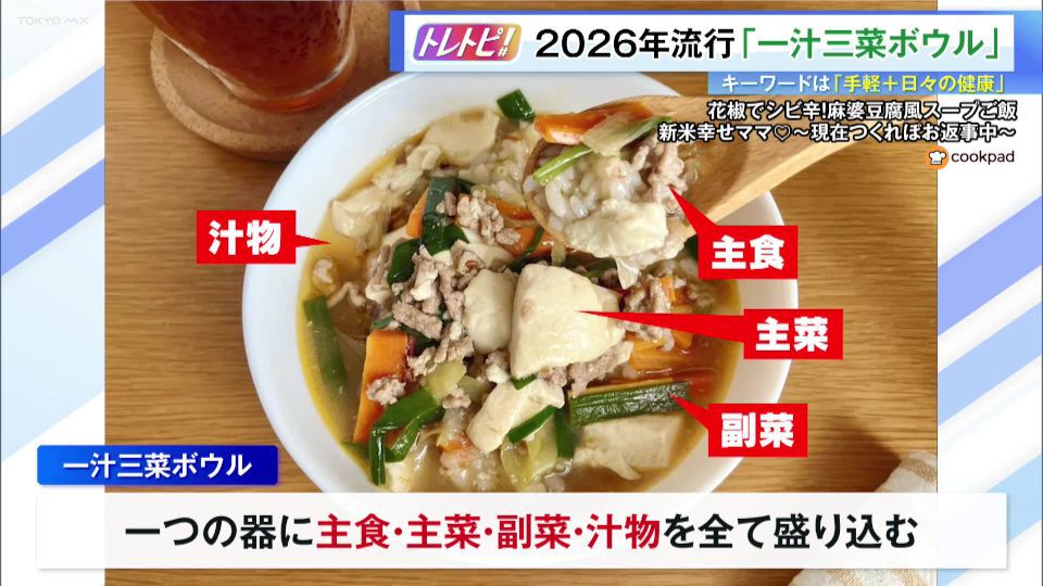 「手軽+日々の健康」を実現するのが『一汁三菜ボウル』です。これは一つの器の中に主食、主菜、副菜、汁物の要素をすべて盛り込むスタイルで、一品だけで栄養バランスは十分!