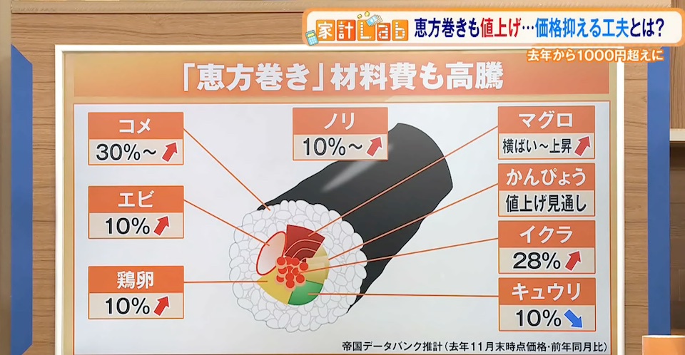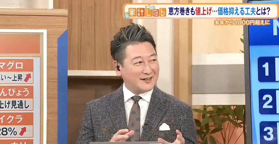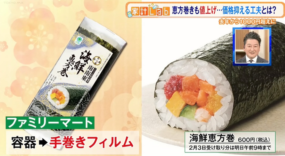 TOKYO MX(地上波9ch)の報道・情報生番組「堀潤 Live Junction」(毎週月~金曜20:00~)。家計に関するお金のニュースを深掘りする「豊崎由里絵の家計Lab」のコーナーでは、“恵方巻きの価格”について取り上げました。