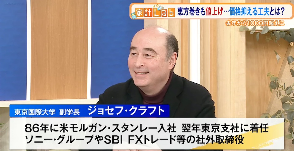 また、東京国際大学 副学長のジョセフ・クラフトさんは恵方巻きが大好きだそうで「年に一回の行事なので、ちょっと贅沢に」と節分の過ごし方を明かしつつ「以前はカカオ豆の高騰でチョコレートが高く、今回は恵方巻きが値上がりした。世知辛い世の中だなと思う」と嘆いていました。