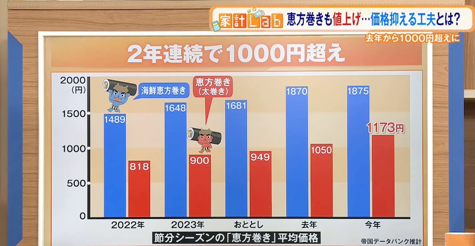 帝国データバンクによると、節分シーズンにおける恵方巻きの平均価格は2022年が818円。しかし、2025年は1,050円。今年は1,173円となり、2年連続で1,000円を超えています。また、高級志向なものが多い海鮮恵方巻きも年々価格が上昇しています。