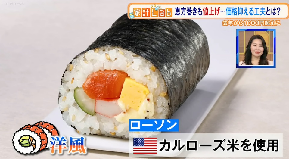 そして、ローソンでは高騰している国産米ではなくアメリカ産のカルローズ米を使用。カリフォルニアロールをイメージした洋風恵方巻きを展開しています。