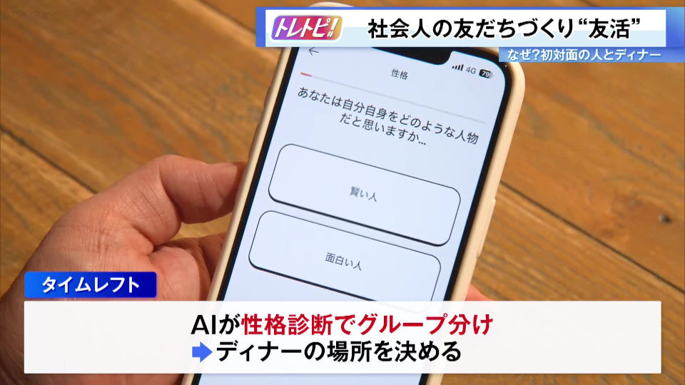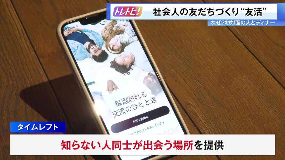 年齢や職業もバラバラの4人がディナーを共にしたきっかけは、スマホアプリ。社会人の友達探しをサポートする「タイムレフト」は、知らない人同士が出会う場所を提供するサービスです。