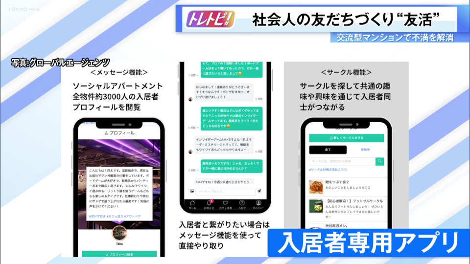 施設担当者は「ネットワーク上だけではなく、リアルな場で深い人との繋がりを肌で感じたい人が増えており、そうした意味でも友活やソーシャルアパートメントが求められている」と解説していました。