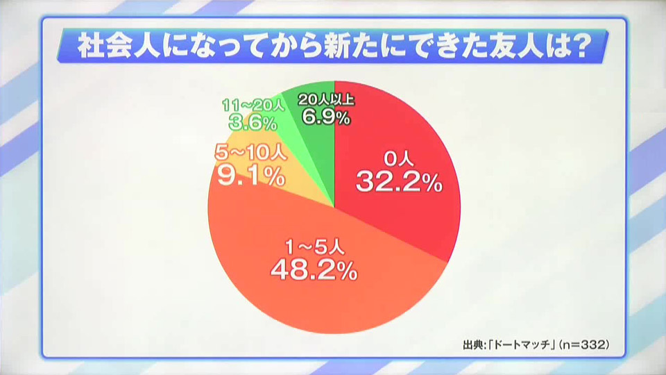 ある調査によると、「社会人になってから新たにできた友人は?」という問いに、「0人」と答えた人が32.2%に上り、約3人に1人が、社会人になってから新しい友達ができていないという結果が出ています。
