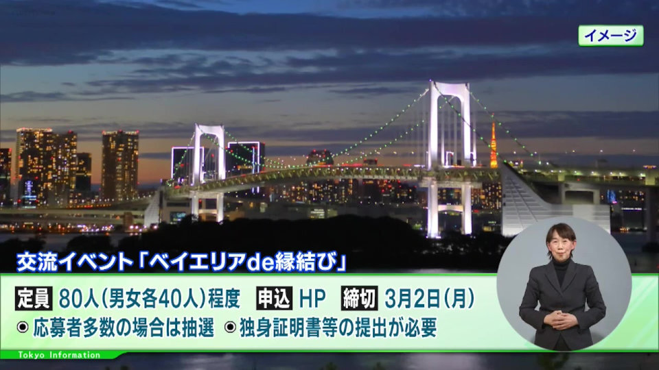 3月8日(日)に開催される交流イベントでは、浜松町シーバンスN館カンファレンスで交流を深めたあと、日の出からお台場海浜公園まで貸切船に乗って、フリートークを楽しみます。対象は、都内在住、在学、在勤の18歳以上の独身の人で、別途、会員登録が必要です。定員は男女それぞれ40人程度で、申し込みの締め切りは3月2日(月)です。