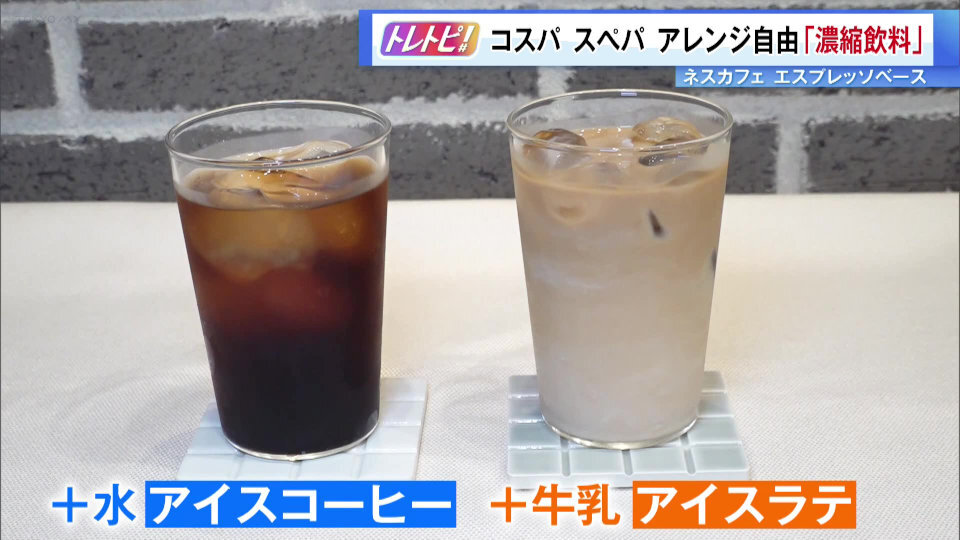 濃縮飲料にはもう一つ、人気の秘密があります。それは「アレンジの幅広さ」。濃縮コーヒーに水を加えてアイスコーヒーとして、また牛乳を加えてアイスラテとして楽しめます。