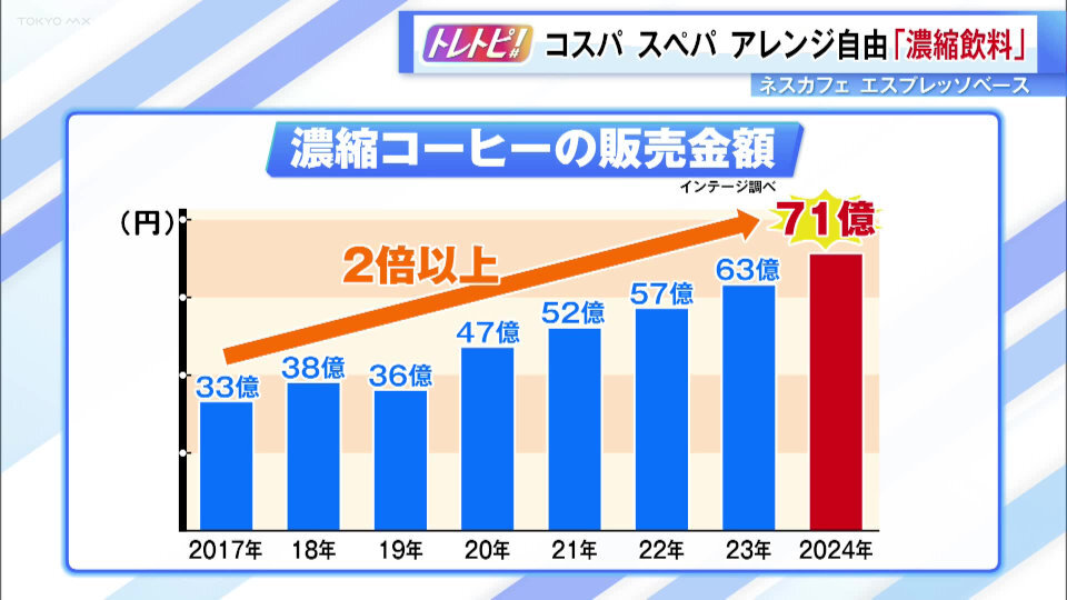 実は2024年の濃縮コーヒー市場は、ここ7年間で急激に伸び、2倍以上の71億円に達しています。なぜ人気が伸びているのでしょうか?