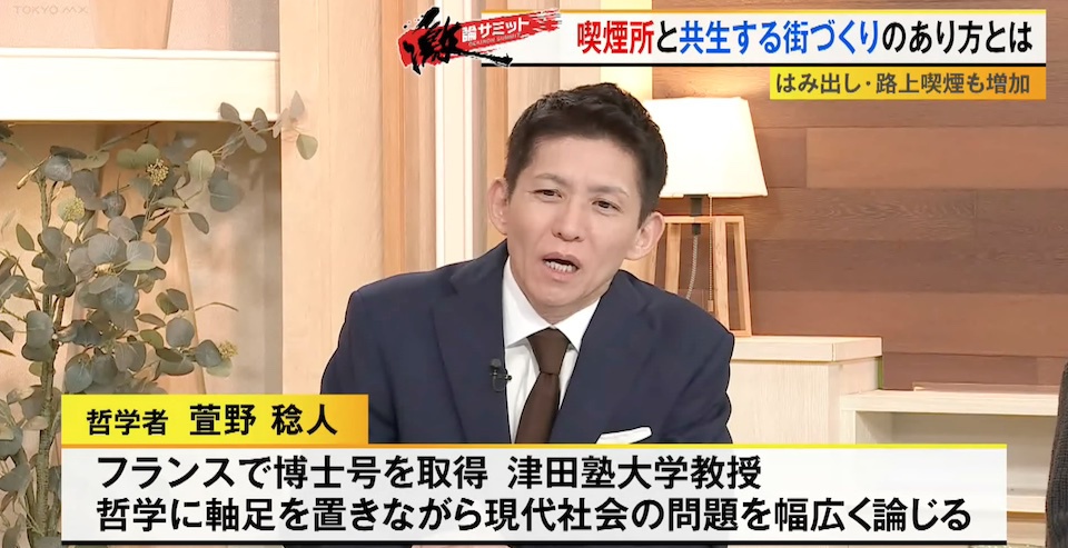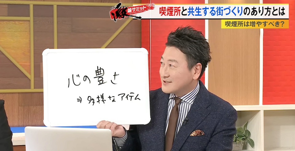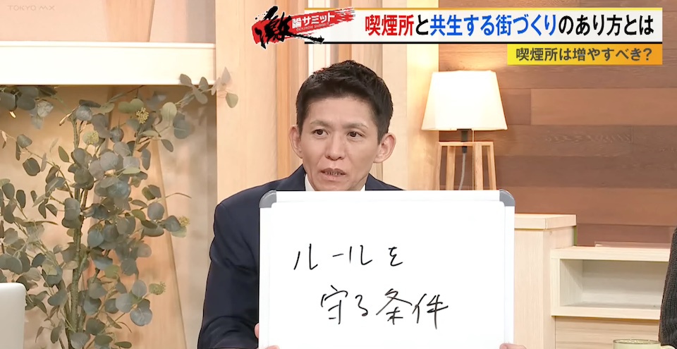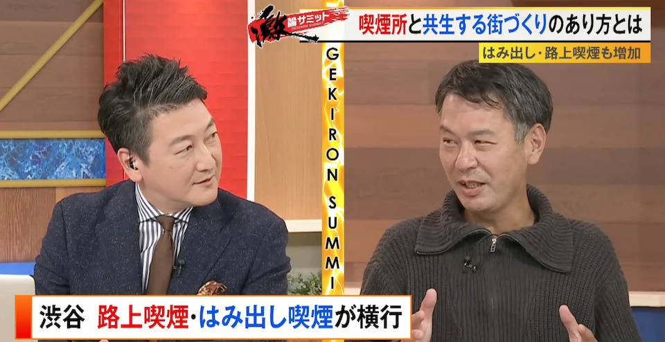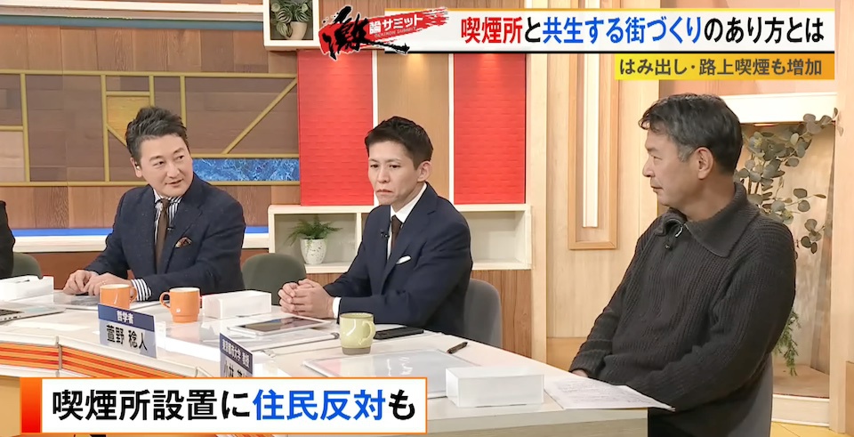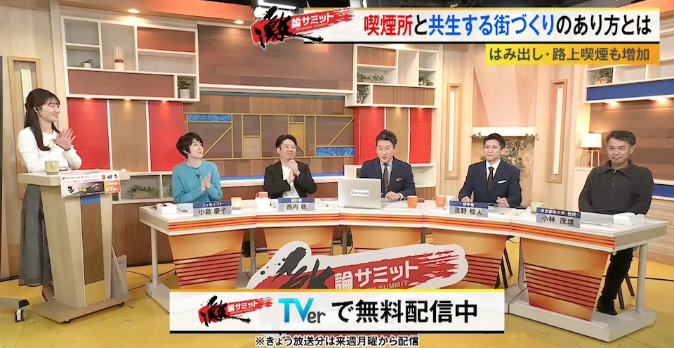 TOKYO MX(地上波9ch)の報道・情報生番組「堀潤激論サミット」(毎週金曜21:00~)。放送では、“喫煙所と共生する街づくり”について議論しました。