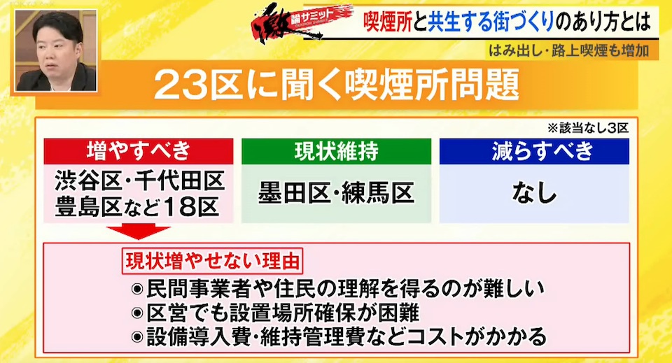 喫煙所は増やすべきなのか。今回、番組では23区にアンケートを実施。その結果、渋谷区や千代田区など18区は「増やすべき」と答え、墨田区と練馬区は現状維持。3区は該当なしで「減らすべき」と答えた区はありませんでした。