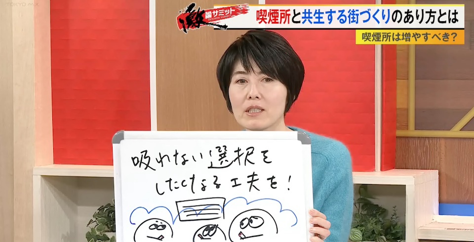 一方で小島さんは喫煙所の増設を歓迎しつつ“吸わない選択をしたくなる工夫を!”。「吸える場所の中に“吸わない選択肢もある”、“吸わない方が健康にいいかも”とか、自分は吸わない選択もできるかもしれないと思えるような情報を提供する。(喫煙所を)そういう場所にしてほしい」と改めて訴えます。