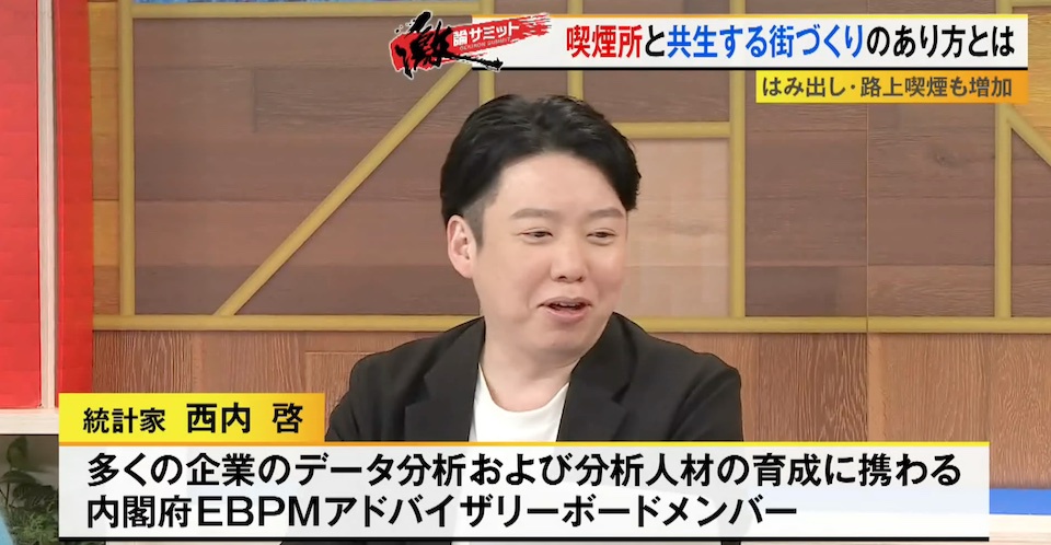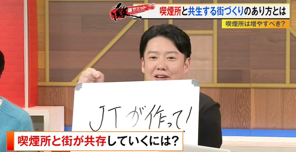 最後に、今回の議論をふまえ喫煙所と街が共存していくにはどうすればいいのか。コメンテーター陣が提言を発表します。まず西内さんは“JT(日本たばこ産業株式会社)が作って!”。「意外とこの論点は出なかったが、経済学では“外部不経済の内部化”といい、取引するお客さん以外に迷惑をかけていたら、その費用を取引の中に入れるのが基本。JTも確かに喫煙所を作っているが足りていない。だから、JTと喫煙者の間でこの問題を解決してほしい」と提案します。