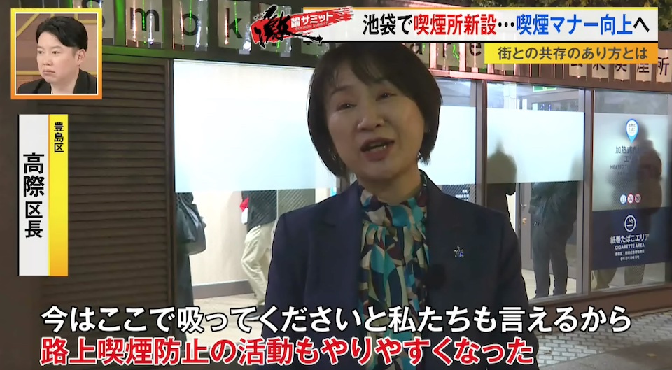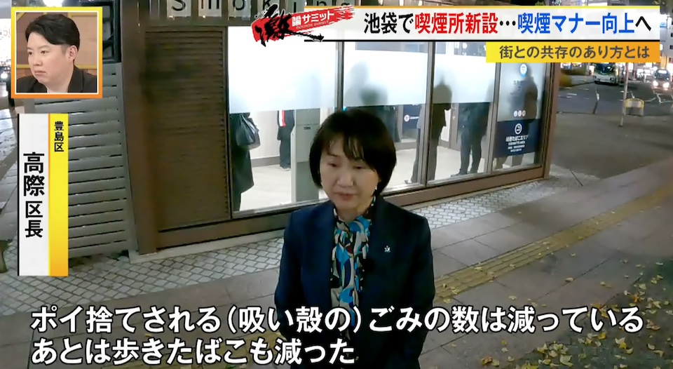 池袋も喫煙所以外の場所“闇スポット”での喫煙が問題となっていましたが、昨年10年ぶりに公衆喫煙所を新設。そして設置から3ヵ月、一定の変化が見え始めているそうで、高際みゆき区長はタバコのポイ捨てや歩きタバコが減少したと言います。