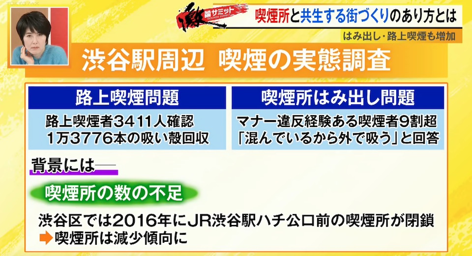 このはみ出し喫煙増加の背景にあるのが喫煙所の減少です。渋谷では近年喫煙所が減少傾向にあり、数少ない喫煙所に喫煙者が集中。喫煙所の混雑が常態化し、外にはみ出してタバコを吸う人が増えているということです。