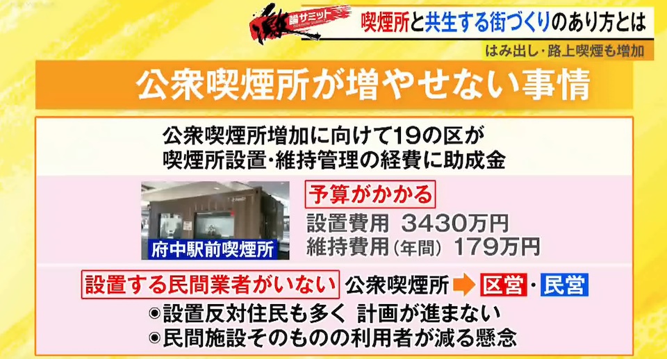 ただ、喫煙所は簡単に増やせるものではありません。現在、公衆喫煙所を巡っては19の区が喫煙所の設置や維持管理に助成金を出しており、その費用がネックになっています。例えば府中駅前の場合、喫煙所設置に3,430万円、維持費用は年間179万円。助成金が出たとしても費用がかかりすぎるため設置が進んでいないそうです。
