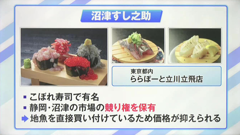 また、ららぽーと立川立飛店には、静岡県・沼津市に本店がある“こぼれ寿司”で有名な「沼津すし之助」があります。こちらは沼津の市場の競り権を持ち、地魚を直接買い付けているため、その分価格が少し抑えられるそうです。