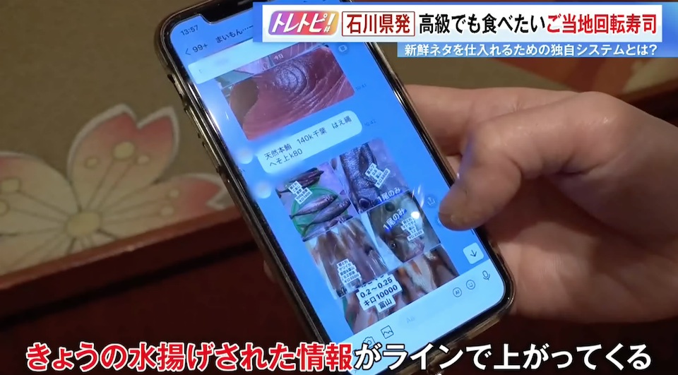 そのシステムについて、金沢まいもん寿司の首都圏・九州・沖縄エリア部長・小池さんは「北陸の網元さんと各店舗の仕入れ担当者がグループラインで繋がっているので、そこに今日の水揚げされた情報が上がってくる。直接やりとりすることでスピーディーにリアルタイムで発注できるところが強み」と解説します。