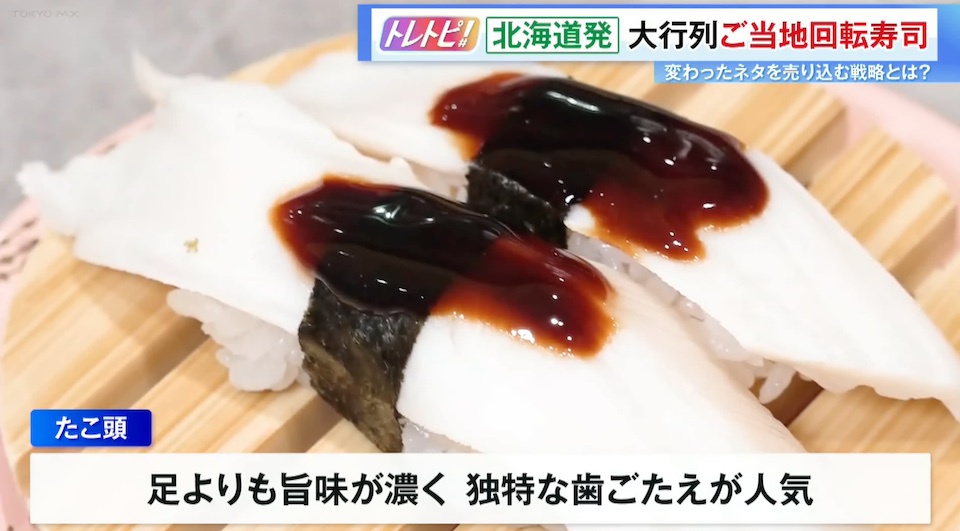 また、関東では足を食べるタコも北海道では頭も食べるということで、タコの頭の握り「北海たこ頭(甘だれ)」を楽しむことができ、足よりも旨味が濃く、独特な歯ごたえが人気だそう。