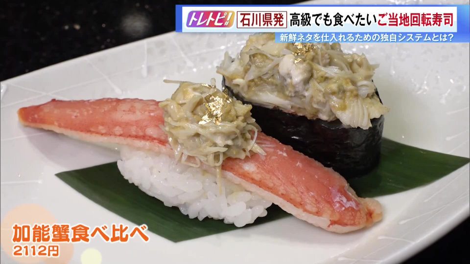さらには、蟹みそ・足・ほぐし身がひと皿で全部食べられる贅沢な「加能蟹の食べ比べ」。少しお値段は張りますが回転寿司とは思えないクオリティの寿司が大好評です。