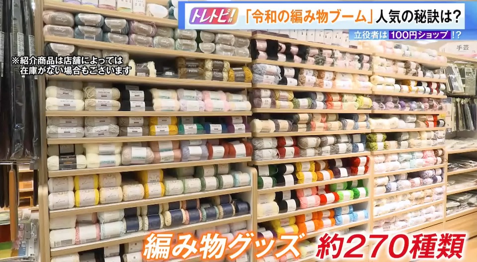 現在の令和の編み物ブームの立役者となったのは「100円ショップ」です。100円ショップ「Seria」カメイドクロック店・エリア店長の坂田さんによると、同店では編み物グッズは約270種類あり、とりわけ毛糸のラインナップは約240種。しかも、その価格は110円と気軽に毛糸を買って編み物に挑戦できます。