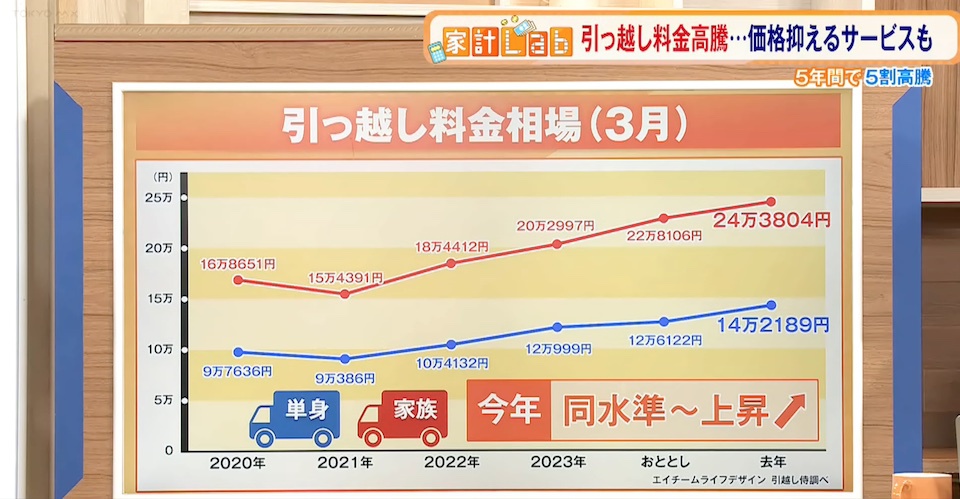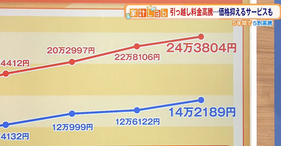 去年3月の単身者の引っ越し料金の相場は約14万2,000円。家族だと約24万3,000円で、この5年間でどちらも約5割値上がりしています。