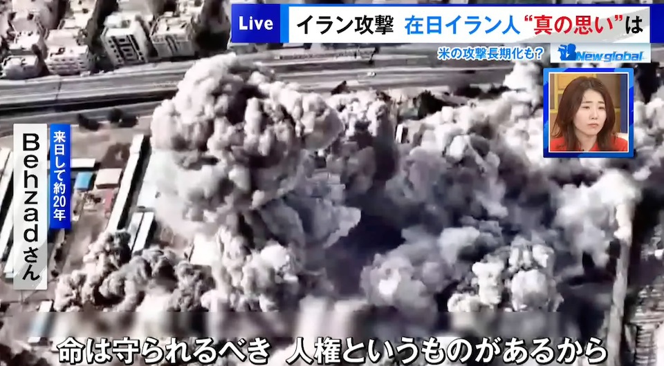 しかし、アメリカ・イスラエルの攻撃は一概に正当化できるわけでもなく、「私たちが望んだのは戦争ではなく軍事援助でした。人間の命は地球の重さより重い。国籍関係なく一人でも殺されるのはダメ。命が守られるべき。人権というものがあるから。私たちのイラン人の血は何か違いますか? 命が違いますか? 存在が違いますか? 同じ人間です」と訴えます。
