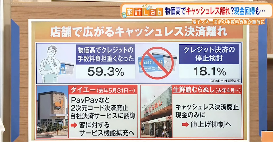 すでに支払い方法を変更した店舗もあります。例えばスーパーマーケットの「ダイエー」は、PayPayなどのコード決済への対応を去年の5月31日で終了。その分、ポイント還元などお客へのサービス機能拡充につなげています。また、宮城県・仙台市のスーパー「生鮮館むらぬし」でも去年4月からキャッシュレス決済を廃止し、支払いは現金のみに。コストを削減することで値上げを抑制しています。