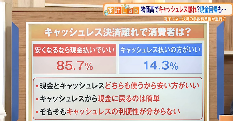 では、消費者は便利なキャッシュレス決済の方がいいのか、それとも少しでも安くなるなら現金払いでもいいのか。番組でアンケートをとったところ「安くなるならば現金払いでいい」が85.7%。「キャッシュレス払いがいい」が14.3%でした。
