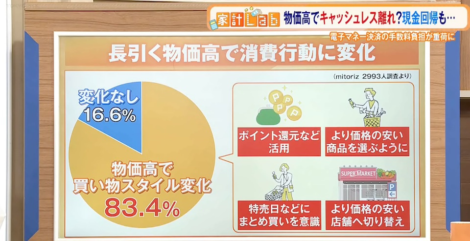 TOKYO MX(地上波9ch)の報道・情報生番組「堀潤 Live Junction」(毎週月~金曜20:00~)。家計に関するお金のニュースを深掘りする「豊崎由里絵の家計Lab」のコーナーでは、物価高による“キャッシュレス決済離れ”について取り上げました。