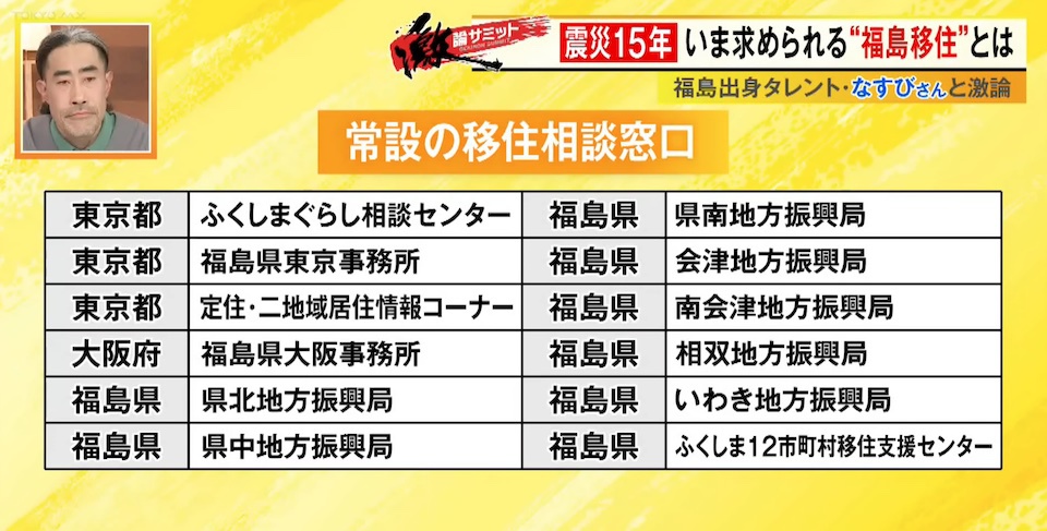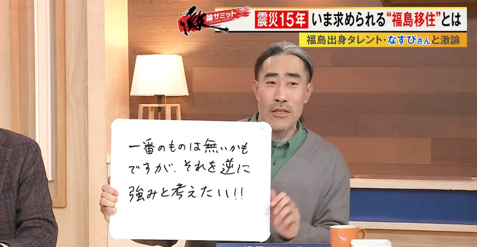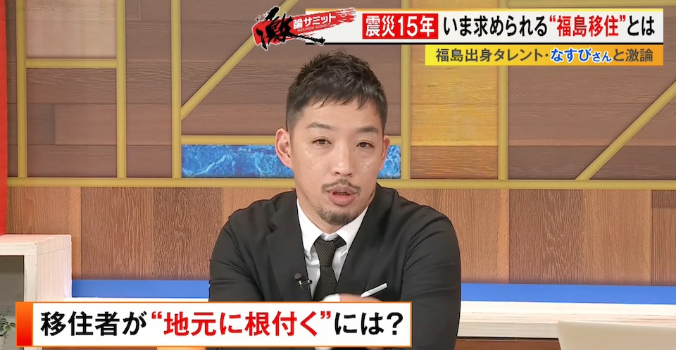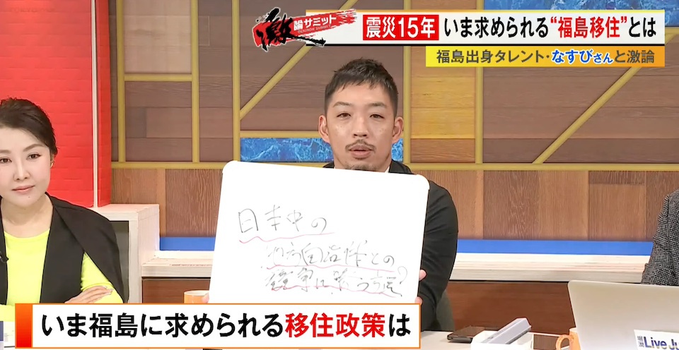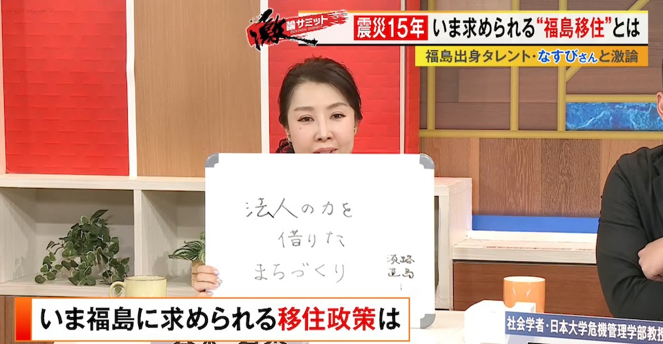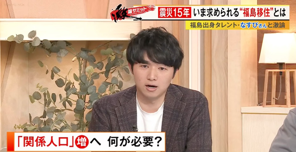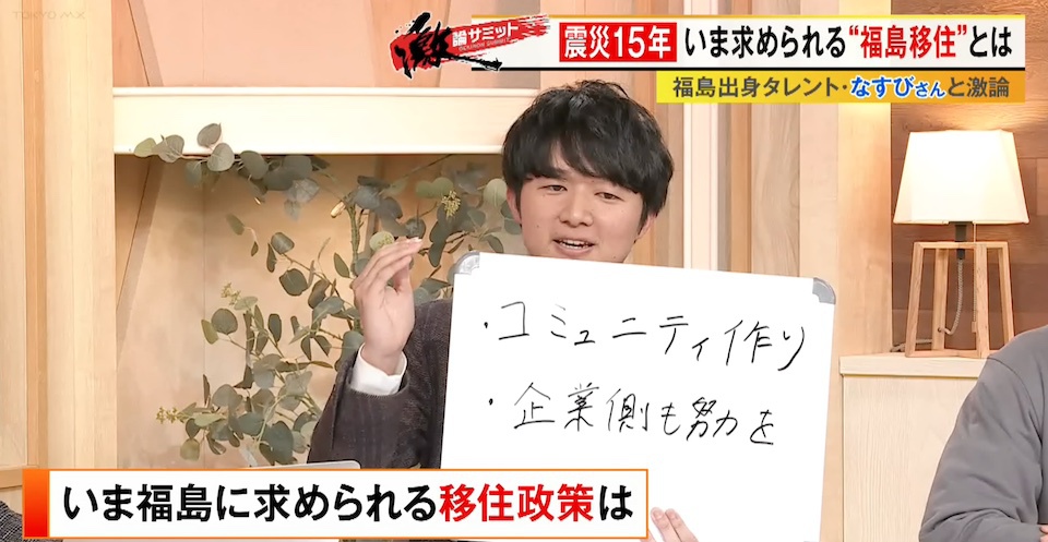 TOKYO MX(地上波9ch)の報道・情報生番組「堀潤激論サミット」(毎週金曜21:00~)。3月13日(金)の放送では、福島県出身の俳優・タレントのなすびさんを迎えて“福島の移住政策”について徹底議論。番組後半では福島県に移住した方を取材。コメンテーター陣が福島に求められている移住政策への提言を発表しました。